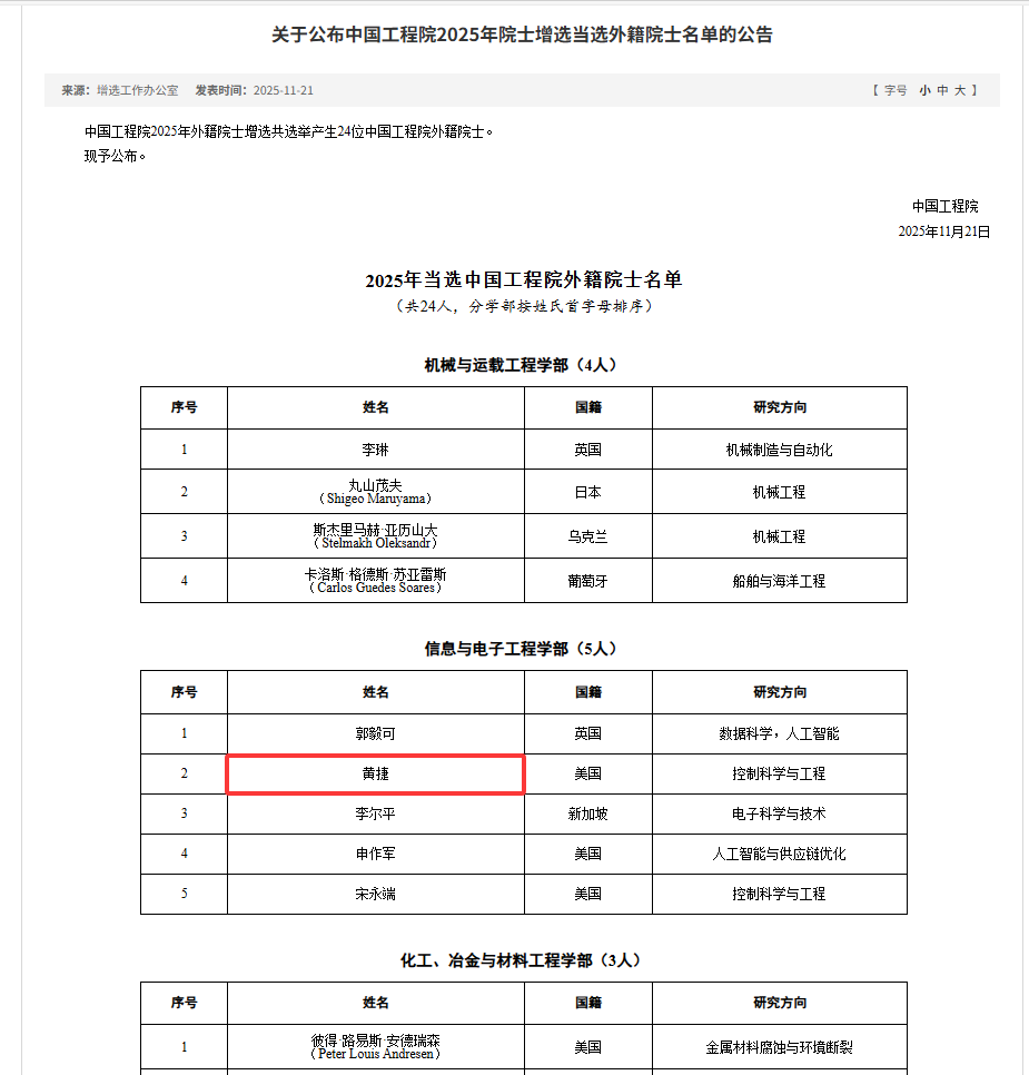 11月21日,中国工程院公布2025年院士增选结果,其中外籍院士24人。控制科学与工程领域顶尖专家、福州大学电气系电力工程1976级优秀校友——黄捷教授荣耀当选中国工程院外籍院士!