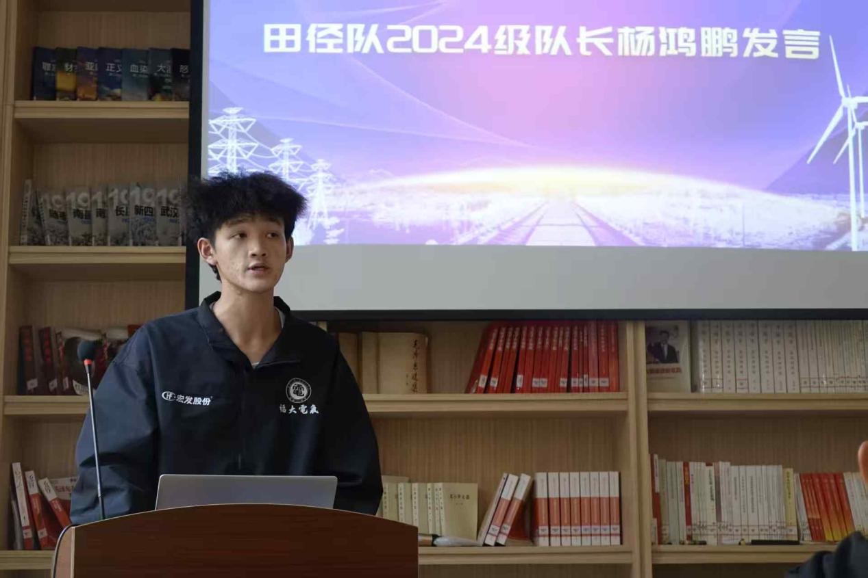 田径队2024级队长杨鸿鹏发言。他从田径队的当下和未来展开阐述,并相信大家对体育的热情会一直传承下去,在明年的赛场上,25级的田径队员们一定能在刻苦训练下成为学校主力。杨鸿鹏同学接着提出了本次校运会期间发现的需要改进的地方。在后勤方面,他表达了对带伤出战运动员的赞赏,同时提出了后续预防训练受伤的措施;在项目上,他建议加强小众项目如三铁的发展;在训练安排上,他针对不同校区的时间进行安排,并且提出晚自习冲突和打车费用的解决方案,鼓励队员们积极训练。杨鸿鹏同学表示,要抱有不服输的心,他期待队员们在沉淀一年后,强势归来。