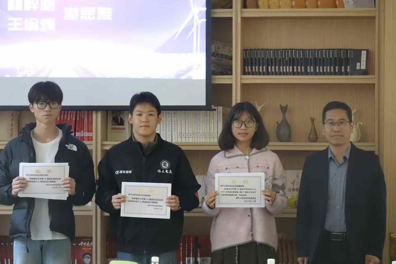 为表彰电气健儿在本届运动会的精彩表现,弘扬“无体育 不电气”的拼搏精神,11月29日上午10时,我院在青马研读社举行第54届校田径运动会表彰总结会。院党委书记潘志辉、院党委副书记杜领军、院团委副书记梁艳华、辅导员李剑峰老师和51暗网