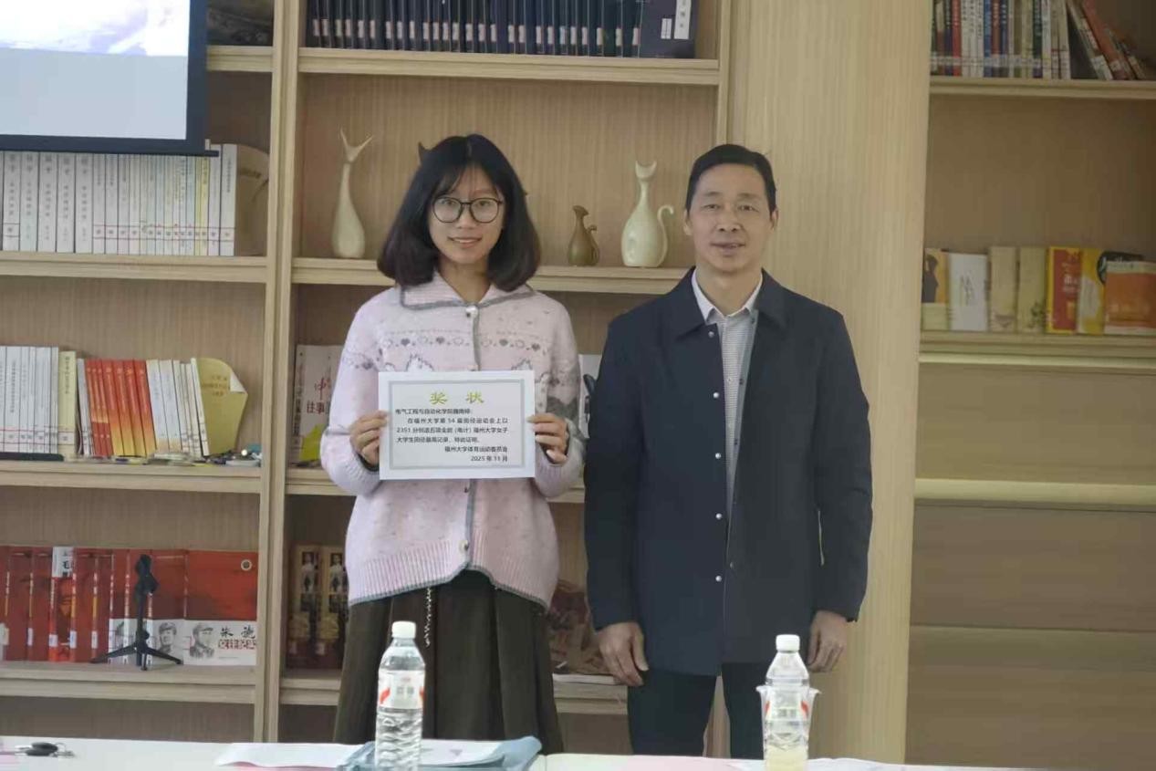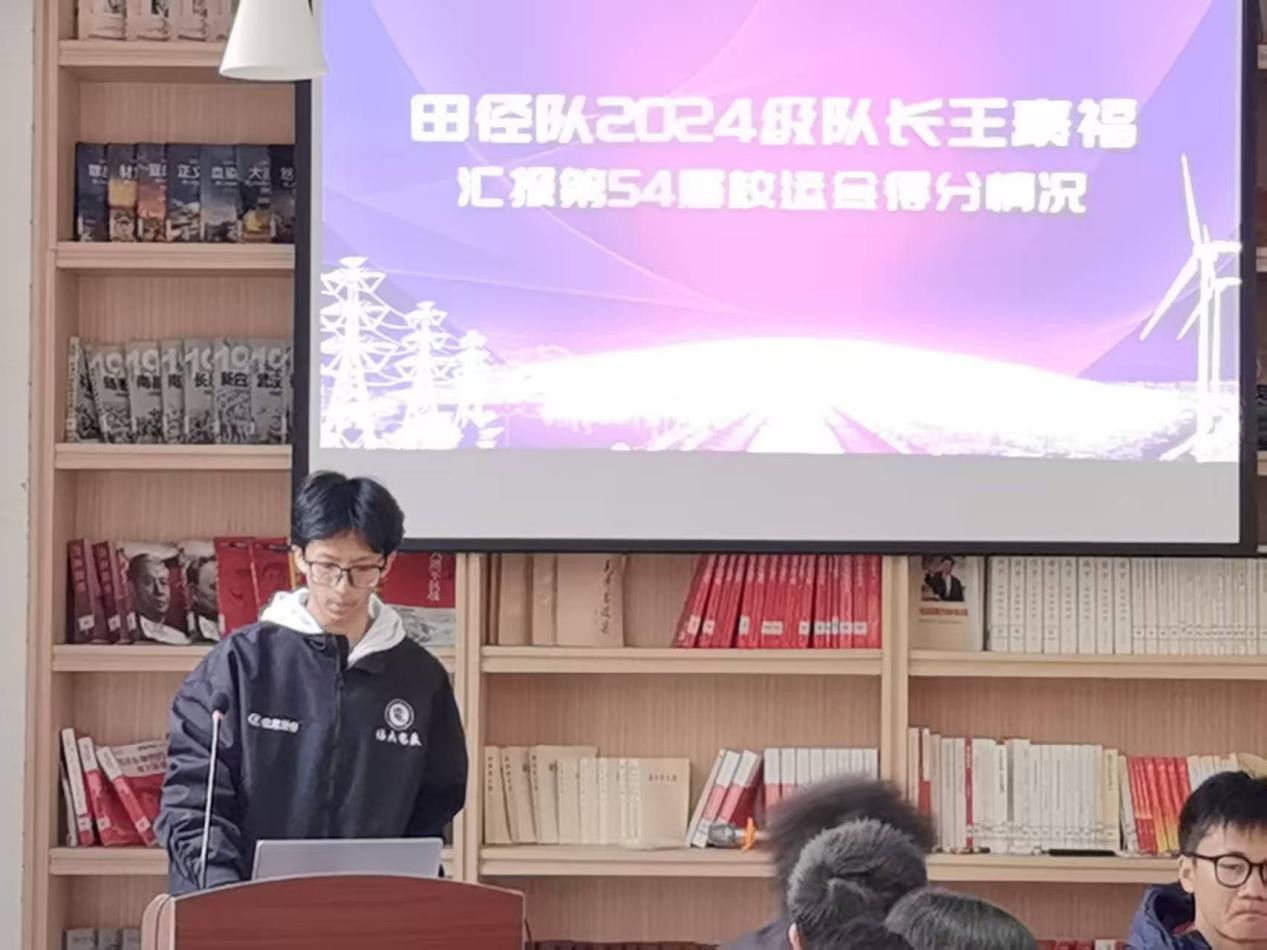 随后,田径队2024级队长王豪福汇报了本届校运会的得分情况,清晰地展现了团队在各项目中的诸多成果:在本届校运会中,我院健儿们勇夺学生团体总分亚军、男学甲亚军和女学甲季军,获得体育道德风尚奖“振奋杯”团体总分第三名;女子4×400米接力、男子跳远、女子跳远等项目均夺得甲组第一名,而在女子五项全能的比赛中,魏雨婷同学更是以2351分的成绩创造校纪录,以突破自我的执着诠释电气底色。电气学子们所展现出的卓越素质,正是对我院“无体育,不电气”的竞技精神的继承与发扬。
