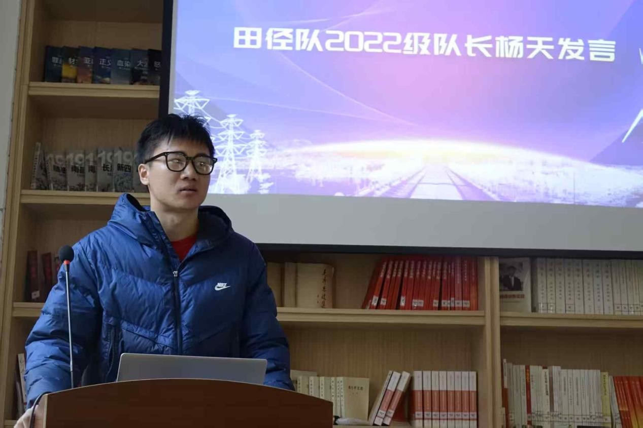 田径队2022级队长杨天上台发言。他首先回顾了从接手队伍到如今交接的过程,表达了对田径队中温暖回忆的怀念。然后他展开本次校运会对自己的反思,并表明明年再上赛场赢得比赛的渴望。他真诚地表达了对教练阿敏老师的帮助的感谢,也欣慰看到许多新队员完成任务,将田径队的未来担在肩上。接着,杨天同学总结出田径队教会他的三种力量,即突破极限的勇气、从失败中汲取力量的韧性和超越自我的追求,他希望田径队的精神能帮助大家超越自己,突破自己,达到新的高度。最后,他强调电气田径队是一群怀揣共同热爱的人,真挚希望田径队和队员能拥有美好未来。
