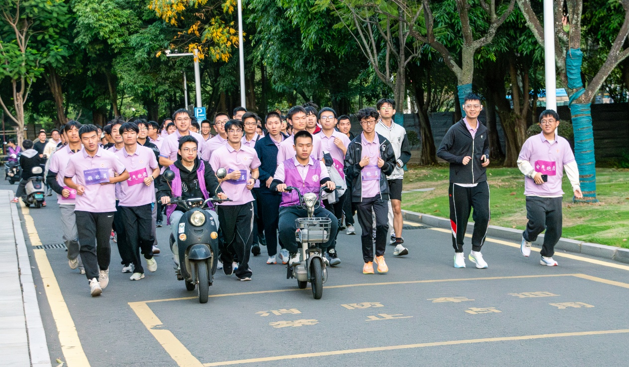 “无体育,不电气” 的优良传统,认为跑团是将体育锻炼从 “竞技”引向 “全员”、从 “活动”引向 “常态”的有益探索,走在了全校前列;邵院长表示,奔跑不仅是运动,更是情感的交流、成长的印记,希望师生在奔跑中打破课堂界限,凝聚学院力量。最后,潘书记向学院研会体育部主要负责人李思捷授旗并宣布跑团活动正式开始。随着发令枪响,由学院领导和普通师生共同组成的跑步队伍精神抖擞地踏上征程,在旗山校区优美环境中并肩奔跑,整齐的队伍成为校园流动的风景线,标志着这一特色活动正式启航。