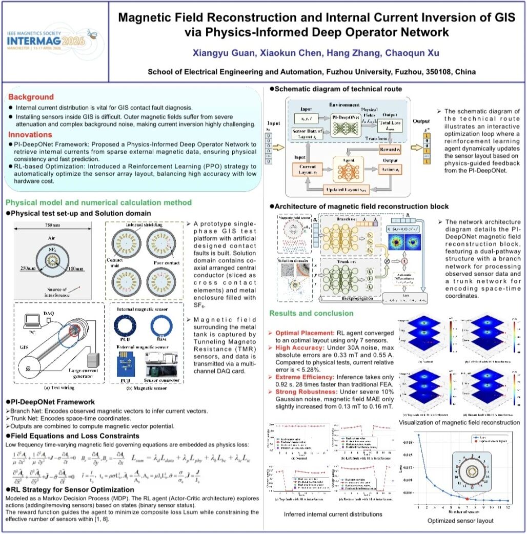 INTERMAG 2026会议上,关向雨副教授展示了最新研究成果,论文题目为《Magnetic Field Reconstruction and Internal Current Inversion of GIS via Physics-Informed Deep Operator Network》。该研究融合物理模型与深度学习方法,为气体绝缘开关设备内部状态的非接触式诊断提供了新思路。INTERMAG是国际磁学领域最具影响力的顶级学术会议之一,议题涵盖先进磁性材料、自旋电子学、生物磁学以及电力系统磁测量等多个前沿方向。