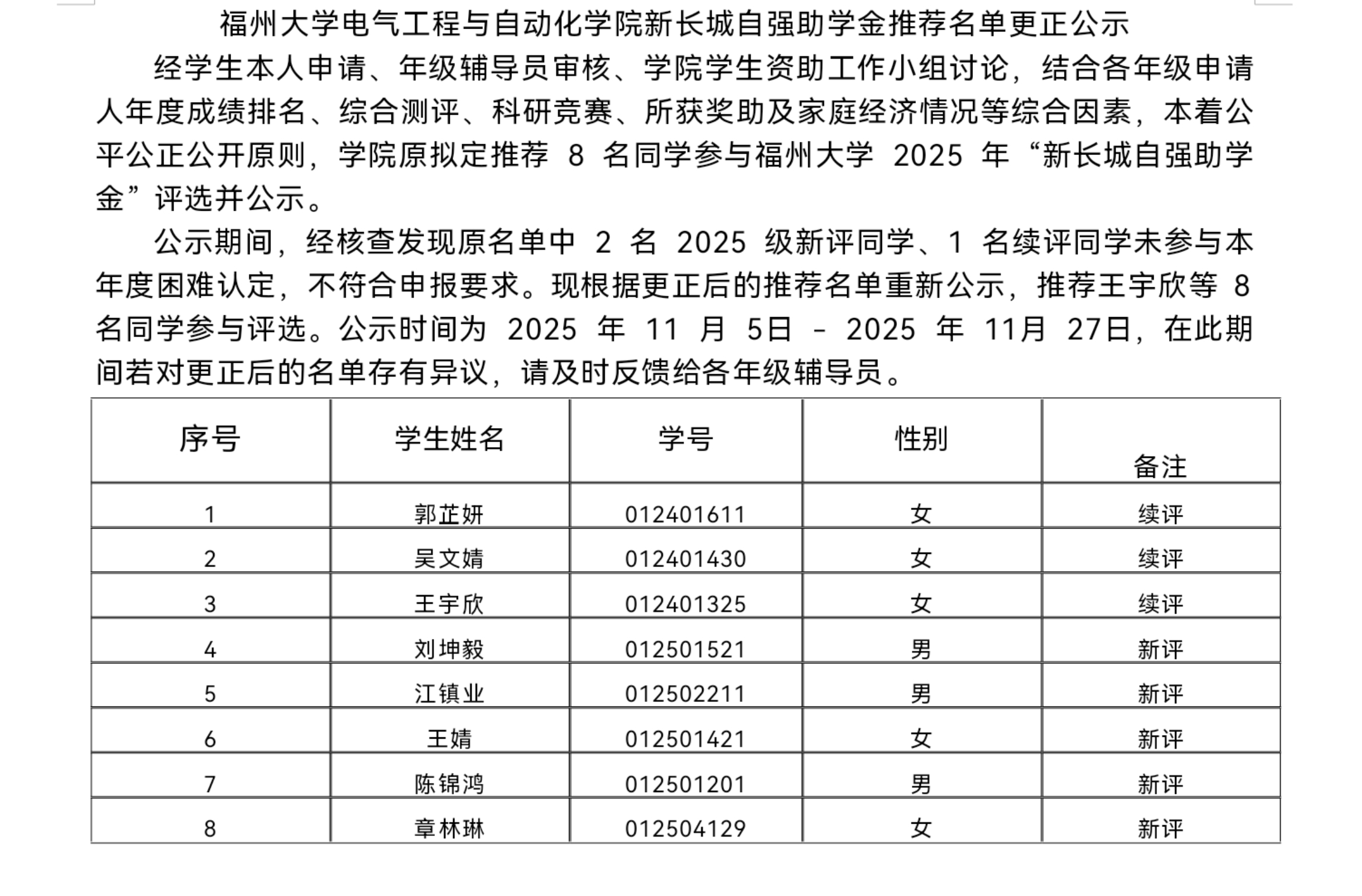 51暗网 新长城自强助学金推荐名单更正公示