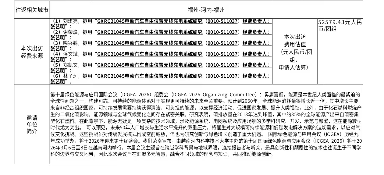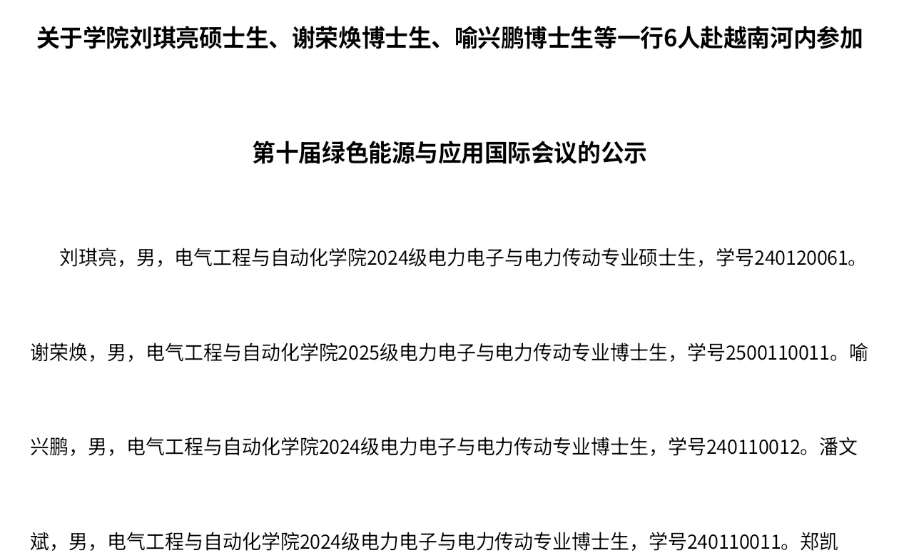 关于学院刘琪亮硕士生、谢荣焕博士生、喻兴鹏博士生等一行6人赴越南河内参加第十届绿色能源与应用国际会议的公示